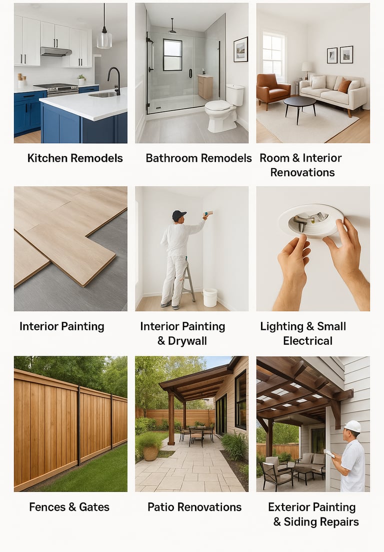 We handle remodeling, sheds, patios, flooring, painting, and light electrical work.